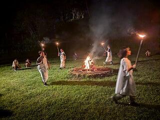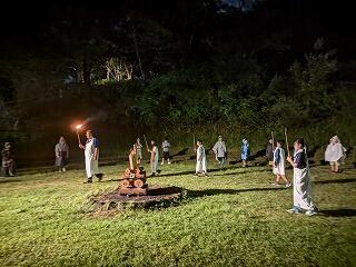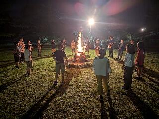 夕食中に雨が降ってきて判断に悩む状況でしたが、開始時刻を遅らせて、野外の営火場でキャンプファイヤーを実施することができました。第1部は儀式で、営火係が誓いのことばを堂々と述べることができました。第2部は各班からの出し物で、しりとりや歌、クイズ等で楽しく盛り上がり、友情を深めました。最後の第3部で営火係を中心に火を大地にかえして、楽しいひと時も終了です。この後、みんな入浴して、班長は小研修室での班長会で明日の連絡事項等を確認し、みんな部屋で過ごし、22時消灯、就寝しました。