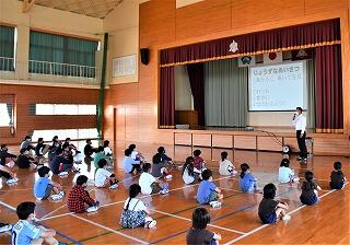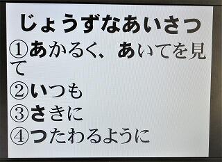 あいさつの合い言葉と「さいふ耳」について、子どもたちはしっかり聞いていました。