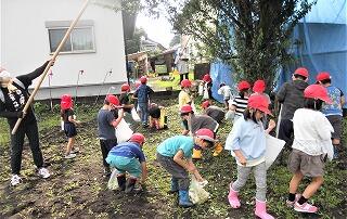5月11日に、幼稚園の園児と小学校1年・2年・あおぞらの児童がサツマイモ植えをしました。植えたサツマイモの種類は「べにはるか」です。