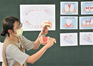 大きな歯の模型を使ったり、どの歯に食べ物が残りやすいかを手鏡を見て観察したりしました。