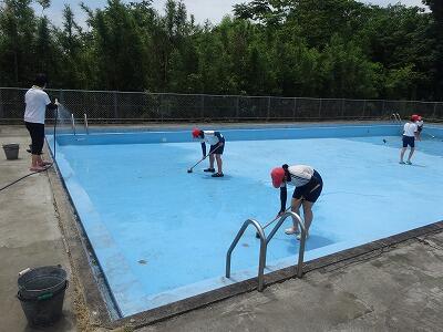雨で延期になっていたプール清掃を行ないました。3~6年生で、作業を分担しながら行ないました。デッキブラシやたわしを使って、プールの壁や床をピカピカに磨きました。来週から始まる水泳の授業が楽しみです。