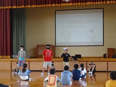 有水タイムの時間を使って、各委員活動の紹介がありしまた。学校生活が気持ちよく過ごせるために、日々どんな活動をしているのか、スライドや寸劇等を通して分かりやすく紹介していました。