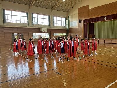 こども園の子どもたち、小学校の子どもたち、そして中学校の生徒が全員集合して行いました。