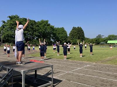 ラジオ体操です。みんな上手です。代表の人がとっても上手!