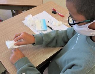 保健室の先生が、学級活動の授業で、けがの手当のしかたについて教えてくださいました。