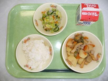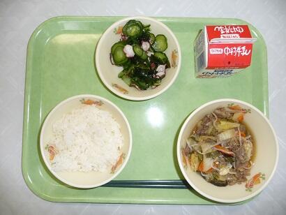 今日の給食は、ご飯、すきやき、たこの酢の物でした。