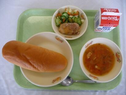 今日のメニューは、ミルクパン、とり肉のバーベキューソースかけ、カリフラワーのサラダ、トマトスープでした。