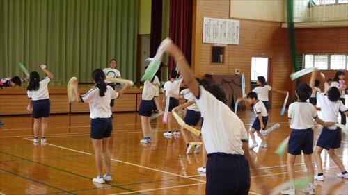 「んまつーぽす」(反対から読んだらすぽーつまん)という方々が表現運動を指導して下さいました。上学年は用具などを使った創作ダンス、下学年はオリンピック選手になりきる創作ダンスを行い、子ども達の生き生きとした動きと表情が見られていました。