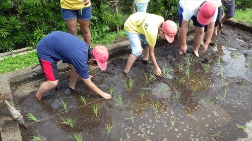 5年生が学校の敷地内の土地を水田にして、田植えを行いました。これから大切に稲を育てて収穫までできるといいです。