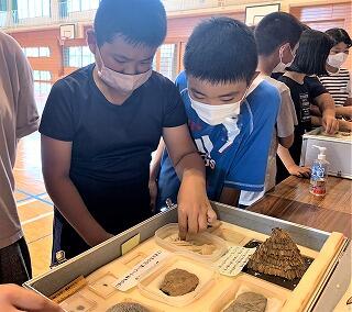 市内から出土した縄文時代や弥生時代の土器等を見せていただきました。6年生の子ども達は興味深く見入っていました。