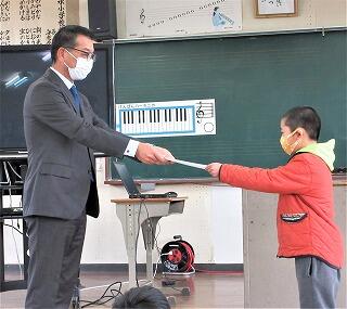最後に、表彰です。2学期の読書はみんながんばったのですが、特にがんばった人の代表に、校長先生が表彰してくださいました。