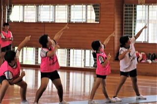 プロサッカーチームのゴールが決まった後のパフォーマンスをつくりました。グループごとに、選手の名前の一文字をダンスにしました。子どもたちの創作する力のすばらしさを感じました。