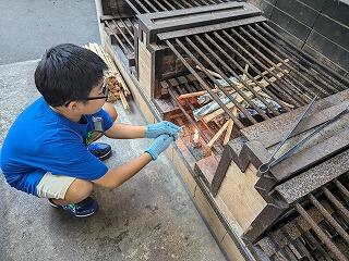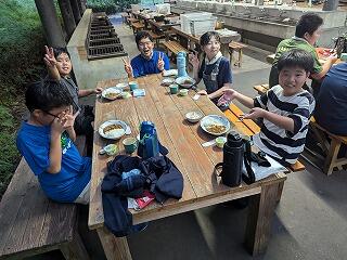 今日の夕食は、子供たちが班で協力してつくりました。かまど番で火の管理をする係や材料を準備して調理する係等、自分たちで相談しながら進めて、どの班もカレーができあがりました。調理室jからマカロニサラダとゼリーを運んで、班ごとに「いただきます!」おいしいカレーにみんな舌鼓、大満足でした。ただ、食べた後の後片付けのチェックにより片づけをやり直しする中で、次の人がつかうためにきれいにすることが大切なことや、片付けを丁寧すること等も学べだようです。