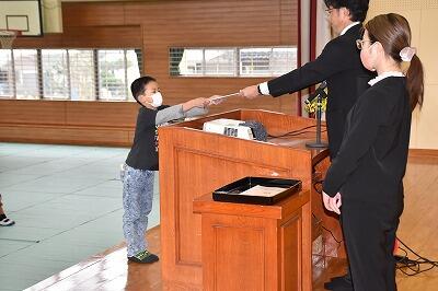 いよいよ今年度度締めくくりの式です。6年生が卒業し、いつも以上に体育館が広く感じ、とても寂しい感じがしました。修了式では、各学年の代表児童が、校長先生から修了証を受け取りました。その後、3年生が全校児童を代表して、3頑張り頑張りを作文発表しました。校長先生からは、修了証の意味や目指す児童像等について話がありました。明日から、春休み、安全に気を付けて過ごしてほしいと思います。