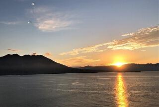 2日目の朝、桜島からの朝日がきれいでした。今日は快晴です。
