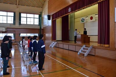 今月25日(月)の卒業式に向けて予行練習を行いました。本番通り、入場から、証書授与、祝辞、別れの歌・呼びかけ、退場まで、最初から最後まで通して行いました。これまでの練習してきたことを一つ一つ思い出しながら確認していきました。声の出し方や礼のタイミング、動き方等、どんどんスムーズになってきています。本番が楽しみです。当日は、25名の卒業生が有水小を巣立っていきます。