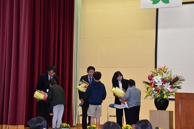 本年度の定期異動に伴いまして、有水小をたくさんの先生方が去られるということで、卒業生も在校生も、とても寂しそうでした。5年生が別れの挨拶をした後、代表児童が花束を贈呈しました。
