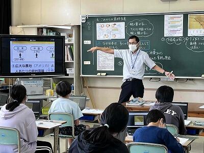 5年生のクラスで社会の研究授業が行われました。「これからの食料生産」という学習内容で、グラフ等の資料をもとに「なぜ、日本は多くの食料を輸入しているのか」を考えていきました。タブレット中に準備された資料を使って調べたり、意見を交換したりしながら取り組みました。