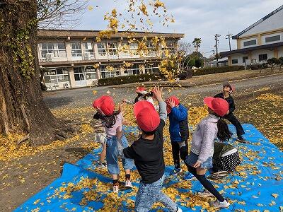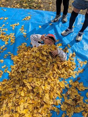 1・2年生が、生活の時間に校庭のイチョウの木の所で秋を楽しみました。黄色く色づいた葉っぱで、落ち葉の布団を作ったり落ち葉のシャワーを浴びたりなど、全身で秋を感じていました。