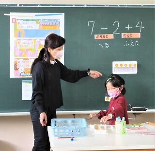 1年生の算数の授業(3つのかずのけいさん)を先生方が見に来られました。