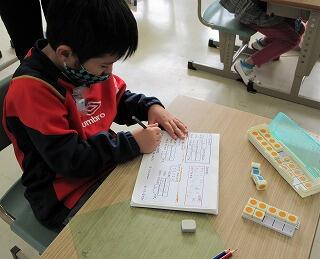 ひきざんとたしざんが混ざった式の解き方を数図ブロックを操作しながら考えていました。