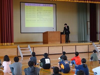 4月の全校朝会が行なわれました。今回は、校長先生から、北原白秋の「ひとつのことば」という詩の紹介がありました。ことばを使うこの大切さについての内容で、これは、本校の目指す児童像「自分も人も大切にするこども」につながるものです。明日から「トナえもん」として毎朝唱えていきます。意識しながら言葉を使うことで、目指す児童像に近づいてほしいと思います。