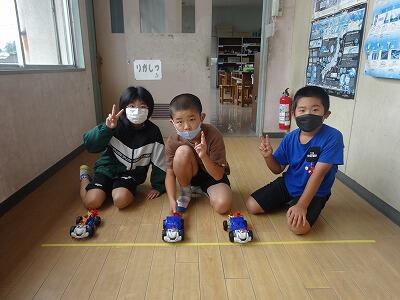 4年生が理科の授業で「電気のはたらき」について学習しています。乾電池2個を使って、どんなつなぎ方をしたら電流が大きくなるのか。模型の車を走らせて実験しています。