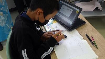 教科の学びを深める手段の1つとして、タブレットの活用を行っています。1・2年生は、生活科のクイズ作りの調べ学習でとして。3・4年生は道徳授業での気持ちの分類をJambordを使って。5年生は家庭科の玉留め・玉結びの仕方を動画で。6年生は算数の授業でQRコードを使って計算の仕方のヒントとして。学年ごとに実態に応じて、いろいろな使い方を行っています。