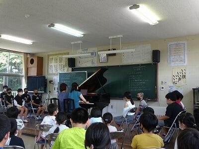 アウトリーチ事業の一貫で、鑑賞教室を行いました。今回は、「アンサンブルの楽しみ」という演目で、新崎姉妹のお二人に、ピアノデュオをしていただきました。普段、耳にしている音楽室のピアノの音色が、数ランク上の音色に聞こえ、子どもたちも聞き入っていました。ピアノの音色が心に響く、素敵なひとときとなりました。