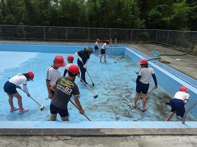 雨で延期になっていたプール清掃を行ないました。3~6年生で、作業を分担しながら行ないました。デッキブラシやたわしを使って、プールの壁や床をピカピカに磨きました。来週から始まる水泳の授業が楽しみです。