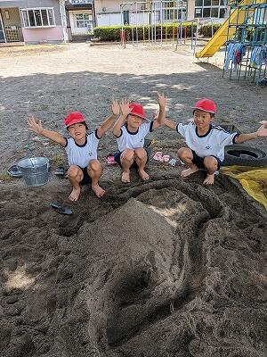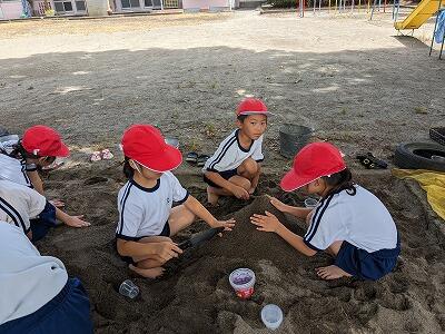 1・2年生が生活科の時間に「なつがやってきた」の学習で、砂場で水を利用した創作活動に取り組みました。水を利用して何度も繰り返し遊びながら、使う物を工夫したり自然の不思議に気付いたりしながら、楽しい時間を過ごしました。