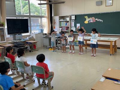 1年生が国語の時間に学習している「大きなかぶ」の音読劇の発表会をしました。今回は2年生だけではなく、有水こども園の園児を招待して行ないました。力強い「うんとこしょ、どっこいしょ」のかけ声を楽しそうに聞いていました。