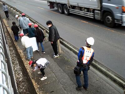 道路沿いには、たくさんのごみが落ちています。空き缶、たばこの吸い殻、一つ一つ火ばさみで拾っていきます。