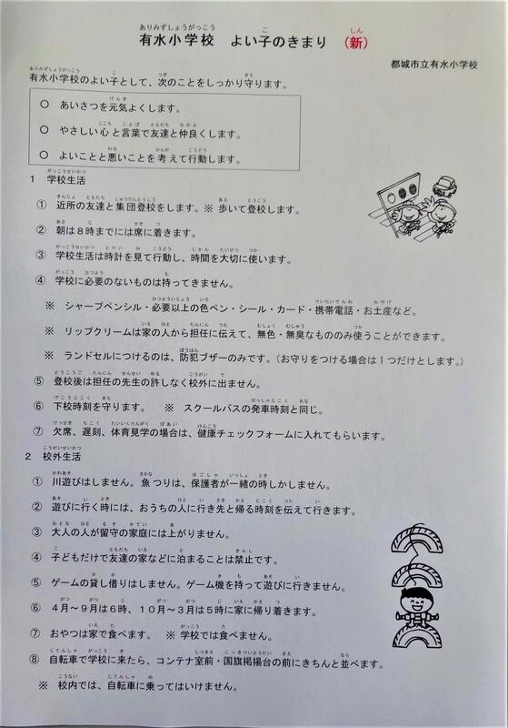 有水小 令和7年度の「よい子のきまり」です。教育ビジョンの「元気いっぱい」「思いやりいっぱい」「夢いっぱい」を合言葉に、自律(自立)した児童の育成に取り組んでいます。