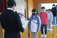 全校朝会を行いました。まず、文集「ともだち」に掲載された5年生2人の発表がありました。2人ともすばらしい内容でした。次に、2年生による詩の音読発表がありました。クイズ形式で全校児童が参加できる楽しい発表でした。担当の先生から、2月の生活目標「気持ちのよいあいさつ!返事!」について話がありました。重点実践事項は「①集団登校や下校時に、班の人や保護者、見守り隊の方、地域の方に出会ったら元気よくあいさつをする。②名前を呼ばれたら、大きな声で返事をする。」ということです。あいさつ週間を実施することの説明もありました。気持ちのよい、あいさついっぱいの学校になってほしいです。最後に、学習やスポーツでがんばった人の表彰がありました。