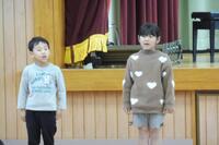 全校朝会を行いました。まず、文集「ともだち」に掲載された5年生2人の発表がありました。2人ともすばらしい内容でした。次に、2年生による詩の音読発表がありました。クイズ形式で全校児童が参加できる楽しい発表でした。担当の先生から、2月の生活目標「気持ちのよいあいさつ!返事!」について話がありました。重点実践事項は「①集団登校や下校時に、班の人や保護者、見守り隊の方、地域の方に出会ったら元気よくあいさつをする。②名前を呼ばれたら、大きな声で返事をする。」ということです。あいさつ週間を実施することの説明もありました。気持ちのよい、あいさついっぱいの学校になってほしいです。最後に、学習やスポーツでがんばった人の表彰がありました。