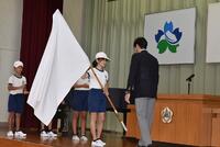 結団式がありました。運動会の結団式は、運動会に向けて、出場する団のメンバーが集まり、心を一つにするための大切なセレモニーです。最初に、団長・副団長の自己紹介がありました。その後、団長が選んだペットボトルを振ることにより、ボトル内の水が変色して、団の色が決定しました。運動会のスローガンは「世界一 やる気MAX 笑顔で終われ 運動会」です。校長先生の話にもあったように、どちらの団も、団長を中心に心を一つにして最後まで「わくわく スマイル いしやま」の石山スピリッツで協力して取り組んでほしいです。