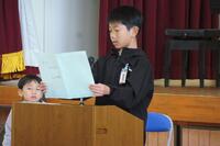 全校朝会を行いました。まず、文集「ともだち」に掲載された5年生2人の発表がありました。2人ともすばらしい内容でした。次に、2年生による詩の音読発表がありました。クイズ形式で全校児童が参加できる楽しい発表でした。担当の先生から、2月の生活目標「気持ちのよいあいさつ!返事!」について話がありました。重点実践事項は「①集団登校や下校時に、班の人や保護者、見守り隊の方、地域の方に出会ったら元気よくあいさつをする。②名前を呼ばれたら、大きな声で返事をする。」ということです。あいさつ週間を実施することの説明もありました。気持ちのよい、あいさついっぱいの学校になってほしいです。最後に、学習やスポーツでがんばった人の表彰がありました。