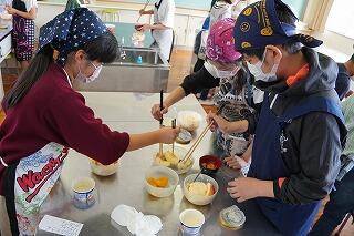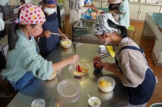 今回は、「フルーツパフェ作り」に挑戦しました。果物を切り分け、班に分かれて各自容器に取り分け、それぞれの好みで色鮮やかに盛り付けました。バニラアイスにりんご、みかん、パイナップルにアラザンをかけて出来上がりました。教室に移動し、静かにいただきお腹も心も満たされました。後片づけまで自分たちでしっかりとできました。