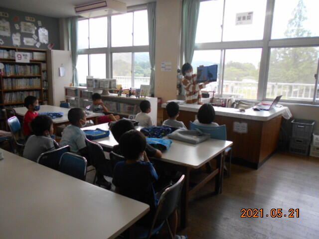図書室にて(図書館サポーターの先生の読み聞かせ→『ダウとを探せ』)