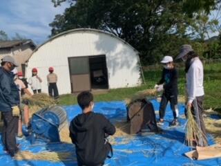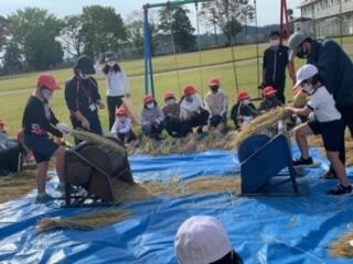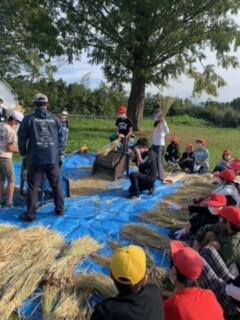 4年生〜6年生 での脱穀(足踏み脱穀機を使用)