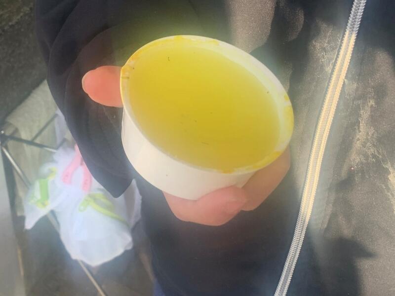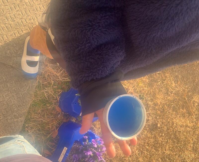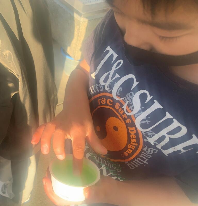 ミニカップに色水(水に絵の具を混ぜたもの)を入れて、