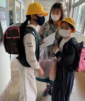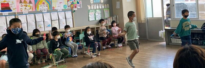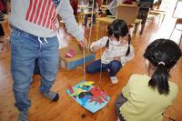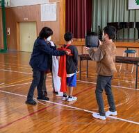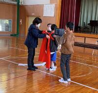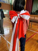 「今までは、赤と白のタスキをそれぞれねじって、合体して作ってました~。」との児童の声