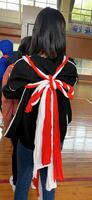 最初に、タスキの端の長さを20~30cmぐらい違えて持つことがポイント