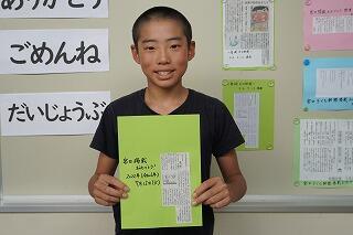 7月第1週の「宮崎県いのちの教育週間」に「いのち」をテーマに書いた作文です。昨日12日(火)は放送で作文を発表しました。全学年の教室から拍手が聞こえてきました。すばらしいですね。本人もとても喜んでいました。