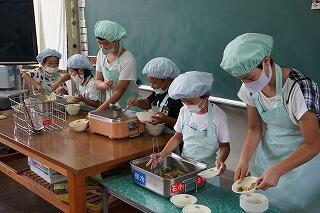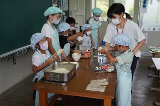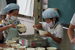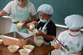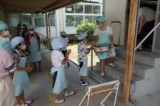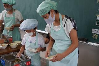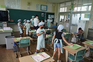 早いもので、1学期も残り1週間で終わりです。今日は2年生の給食当番の様子をお知らせします。2年生になってから、5年生2名にお手伝いをしてもらいながら、本格的に自分たちで当番を始めたのですが、4月に比べ給食の運搬、配膳、片付けまで実によくできるようになってきました。配膳の手際がよくなり、かなり時間短縮しました。おかけで、食べる時間もたっぷり取れるようになってきています。やはり経験ですね。子どもたちにとって大きな成長です。ファイト、2年生。