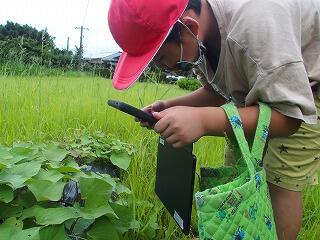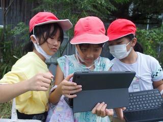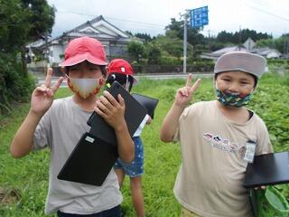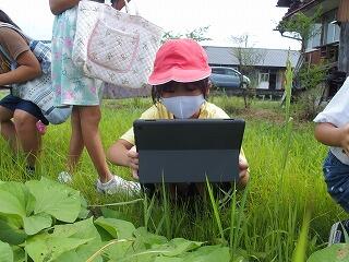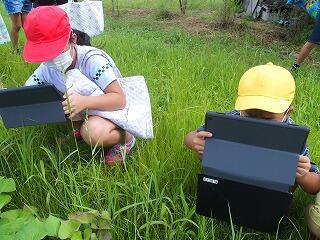 タブレットを持参して、成長の様子を撮影しました。子どもたちの願い通り、大きく育っています。葉の枚数や大きさ、つるの伸びに「大きくなった!」と成長を感じていたようです。「芋ができたかな。」「早く芋掘りがしたいなあ」と11月の収穫を楽しみにしています。