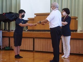 表彰がありました。 7月10日(日)に行われました県スポーツ少年団中央大会 少林寺拳法「演武」の部で3位(6年生)、同3位(2年生)になりました。兄弟です。すばらしいですね。おめでとうございます。