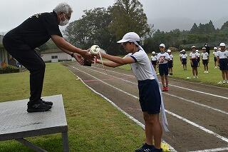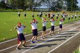 台風による運動場の枝葉も、昨日の子どもたちの頑張りのおかげで片付いて、本日は運動会の全体練習ができました。1回目は雨天のため、オンラインでの練習でしたが、今日はさわやかな秋晴れのもと練習ができました。