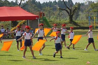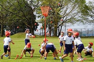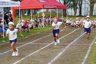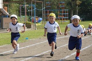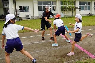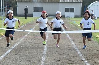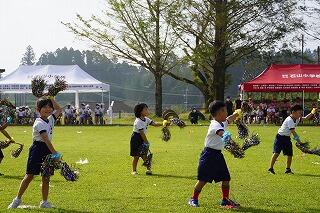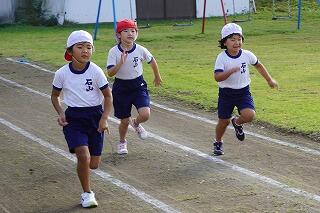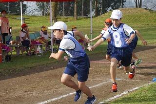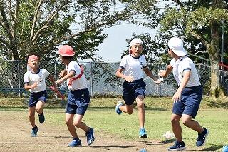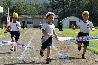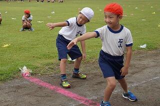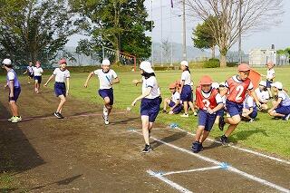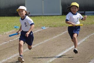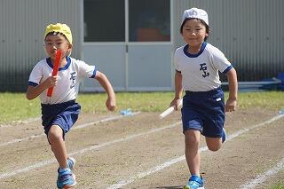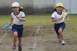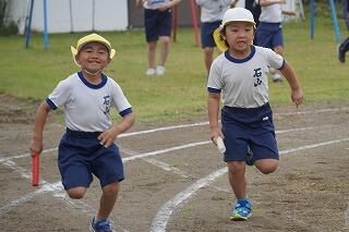 石山小学校と石山幼稚園の合同運動会なので、全校リレーは幼稚園生が第1走です。